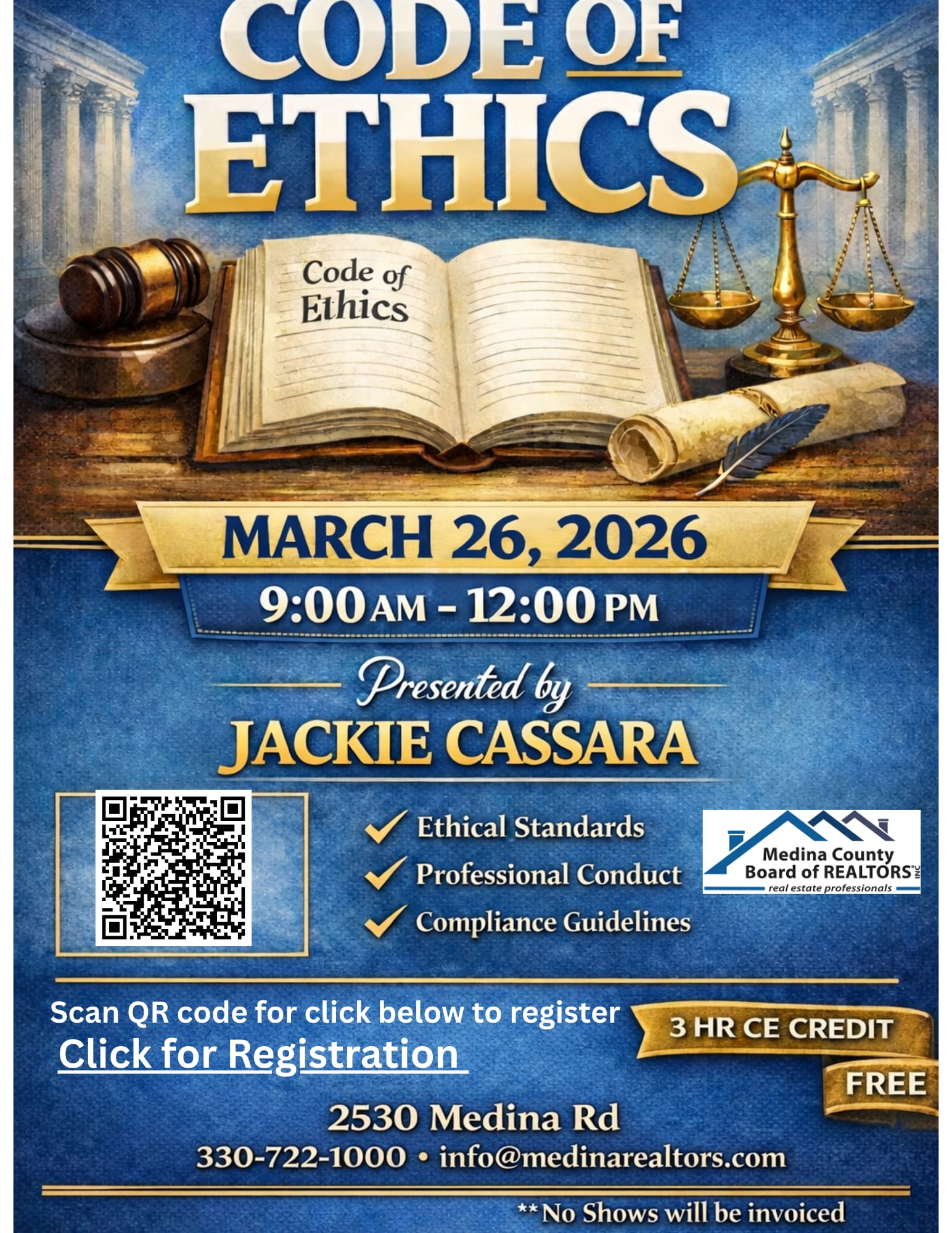 Earn 3 Hours of Ethics. This class fulfills the 3 Hour Ethics Requirement for Ohio Division of Real Estate and NAR. Join us as Instructor: Jackie Cassera teaches the ODRE and NAR required Ethics course. Covering Ohio Ethical standards (law and code). Complaints and Violations.