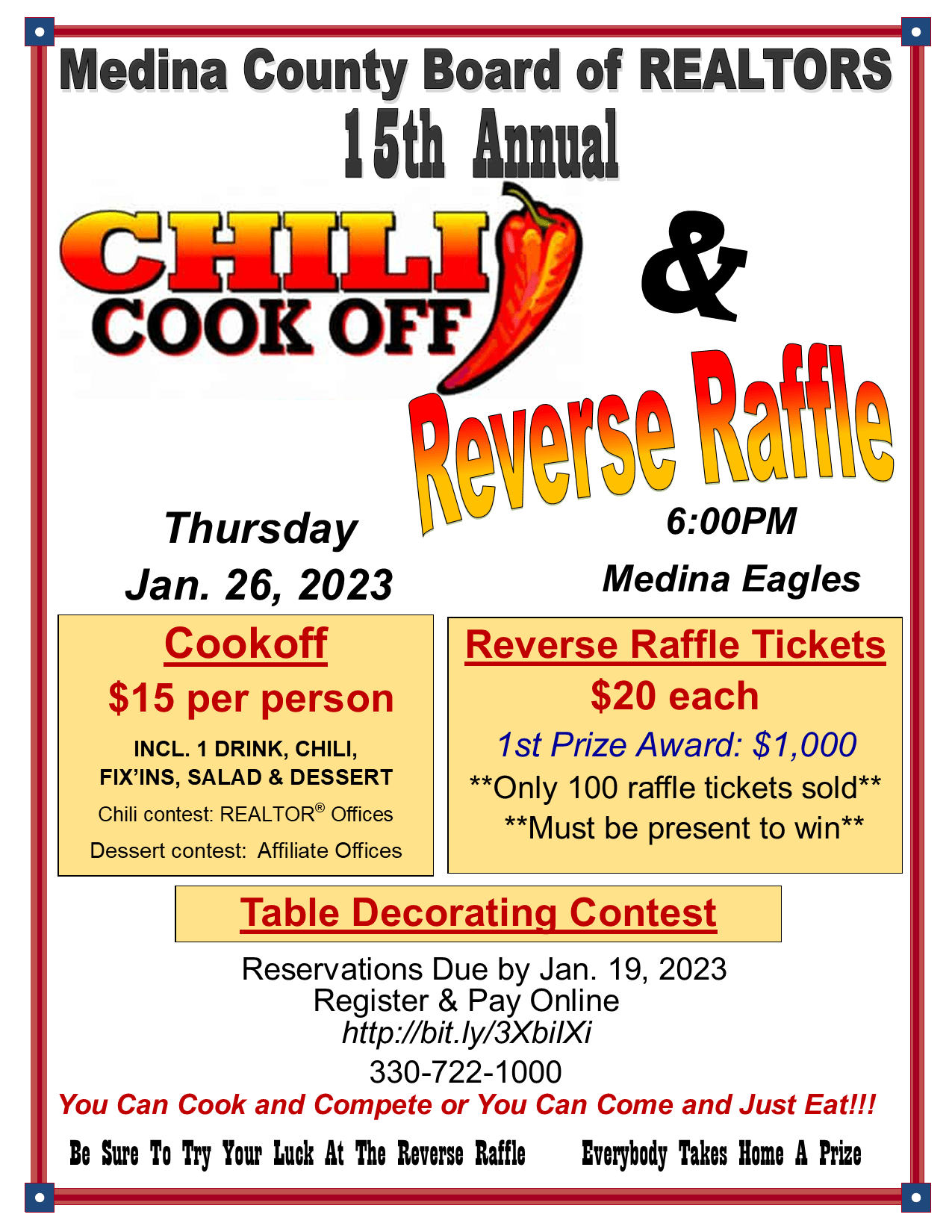 Join us for the 15th Annual Chili Cookoff & Reverse Raffle. For $15 you get to taste all the chilis and vote for your favorite. And be sure to buy a Reverse Raffle Ticket. Only 100 Reverse Raffle Tickets will be sold and limit of 2 tickets per person.