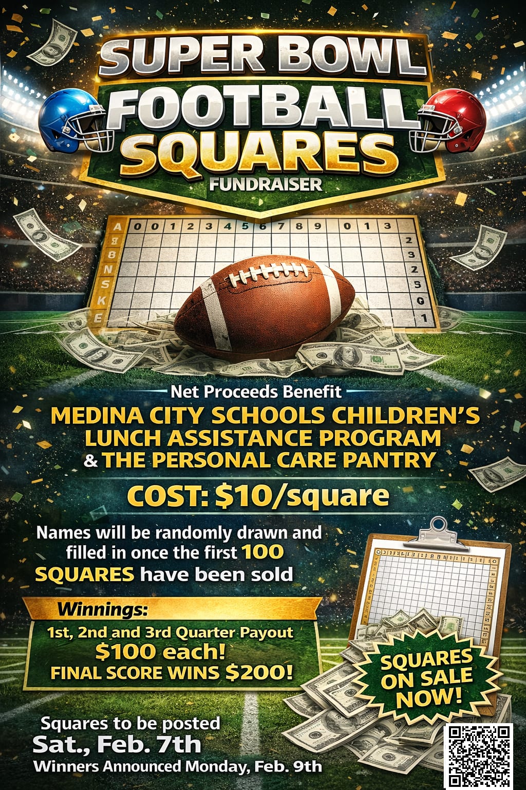 Help us help kids in need. Net proceeds to be split between The Personal Care Pantry and School Lunch Assistance Program at Medina City Schools. Squares $10 each. Names will be randomly drawn and filled in once the first 100 squares have been sold. Then numbers 0-9 will be randomly drawn and filled in across the top for The AFC Team and down for the NFC team. How to Win: A winner will be determined at the end quarters 1, 2 and 3, and for the final game score. The winner is determined by looking at the last number in each teams' score and then matching those numbers on the grid and seeing which square intersects those two numbers. For example, if the score at the end of quarter 1 for the AFC 13 and the NFC team is 10, we use the last numbers in the score (AFC 3 and NFC: 0). The square on the grid that has AFC with a number of 3, and NFC number 0, is the winner for that quarter. Numbers will be posted on the Medina County Board of REALTORS social media sites prior to game day. Winnings: 1st, 2nd and 3rd quarter will pay out $100; Final score will win $200!Images